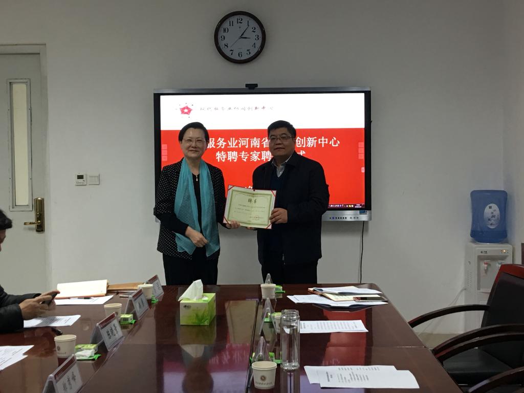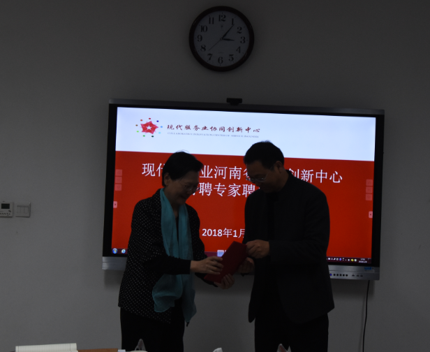 中心主任杨健燕为谷建全、高新才颁发特评专家聘书并致辞。她代表中心对谷建全、高新才两位专家加盟现代服务业河南省协同创新中心表示热烈欢迎和崇高敬意。她指出,2017年,中心紧紧围绕学科建设、科学研究、人才培养和社会服务等重点任务,扎实工作,开拓进取,取得了可喜成绩,在省教育厅开展的中期检查中获得“优秀”等次。2018年,中心要紧紧围绕“以服务于党和国家重大战略为导向,以重大协同创新任务为牵引,以创新体制机制为保障”这一中心任务,立足河南实际,在现代服务业所包含的多个领域内开展协同创新研究,力争招标一批有影响的课题,出版一套有水平的丛书,推出一组有见地的报告,打造一个有特色的智库,全面提升中心的创新能力和智库水平。