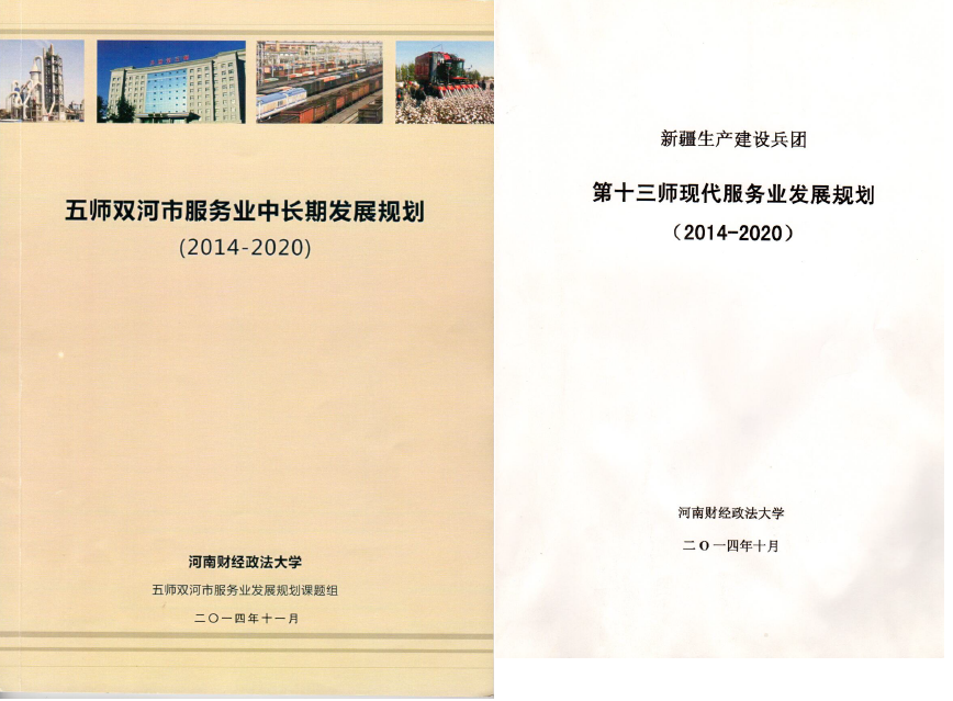 2014年,中心积极参与新疆面向全国的服务业规划招标项目,先后中标了新疆生产建设兵团第十三师现代服务业中长期发展规划(2014——2020)编制项目、新疆生产建设兵团第五师服务业中长期发展规划(2015——2025)编制项目。中心学科带头人带领中心学术骨干、研究生赴新疆与十三师、五师商务局、产业园区、团场、重点企业进行了深入交流,收集了大量的一手资料。在此基础上,对师市服务业的发展规划进行了反复探讨和交流,形成了《第十三师现代服务业发展规划(2014-2020)》、《五师双河市服务业中长期发展规划(2014-2020)》的正式文本,受到师市领导和同行的高度评价。